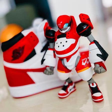 My love for Air Jordan 1 made me settled for this robot inspired by the 1985 sneaker sensation. Matador powered by Sneaker Drive is mecha designed by Ge Chu. This designer toy is manufactured by Devil Toys. An awesome tribute to the original Air Jordan 1 with the basic colors (red, white & black), its AJ1 logo, the tick (that resemble Nike) as well as the chest shaped like the shoe tip. The mecha robot is even wearing its favourite sneaker. Take flight my boy!